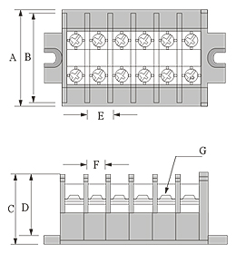 引进型端子,材料采用注射型热固性塑料或 DMC聚酯阻燃。绝 缘性耐高温较好,工作电压交流600V,连接导线截面0.5~25mm2 ,安装使用十分可靠, 片装时底部插入 35mmTH导轨,两边加装固定 件。适用于移动工作中有振动的电器箱过渡连接之用。